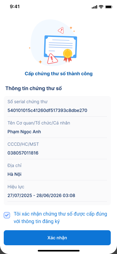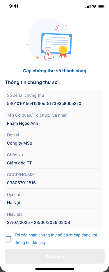 - Kiểm tra kỹ thông tin Chứng thư được cấp bằng việc tích chọn vào đồng ý xác nhận và ấn xác nhận.