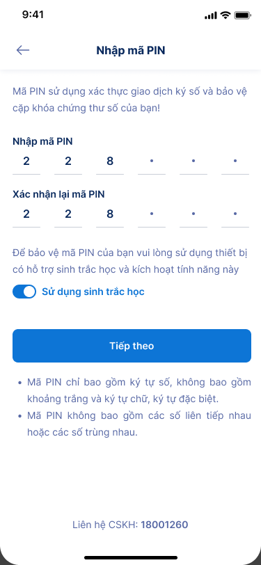 - Quý khách tự thiết lập mã PIN và ấn Tiếp theo.