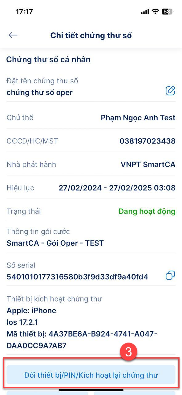 Sau khi gửi yêu cầu đổi thành công, Quý khách cần kích hoạt chứng thư số trước khi sử dụng chứng thư số trên thiết bị mới.