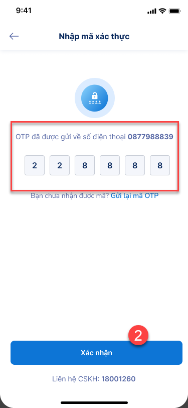 - Nhập mã xác thực OTP gửi về qua SĐT.