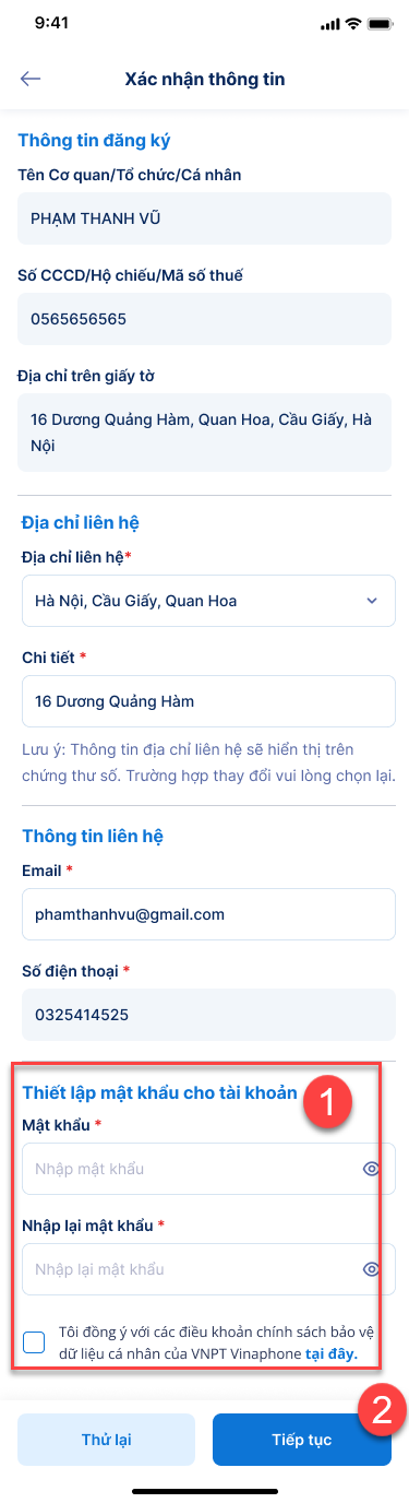 Bước 4: Xác nhận thông tin đăng ký và thiết lập mật khẩu cho tài khoản