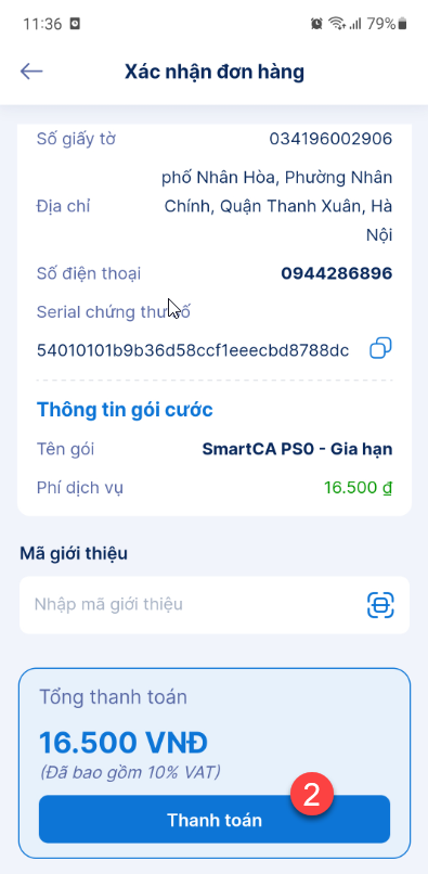 - Lựa chọn gói chứng thư và bấm Thanh toán.