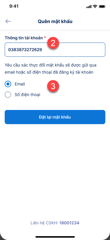 - Chọn đổi mật khẩu qua Email hoặc SĐT và ấn Đặt lại mật khẩu.