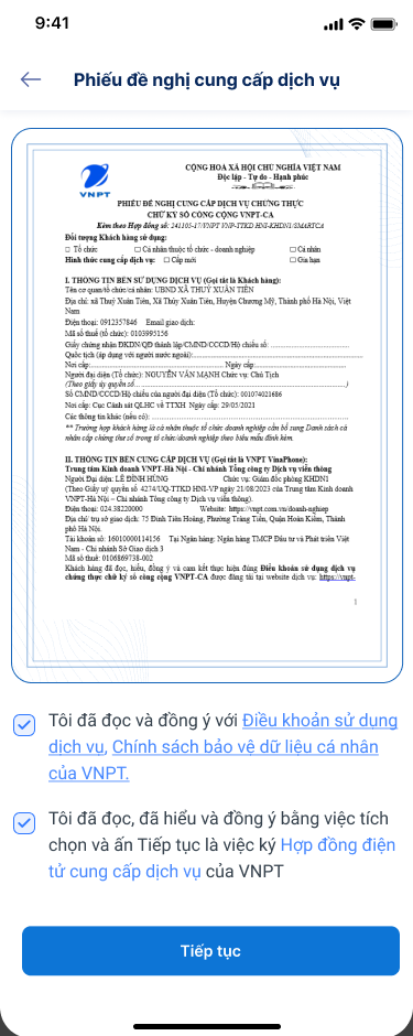 - Thực hiện ký hợp đồng cung cấp dịch vụ bằng việc tích chọn vào các điều khoản và bấm nút Tiếp tục.